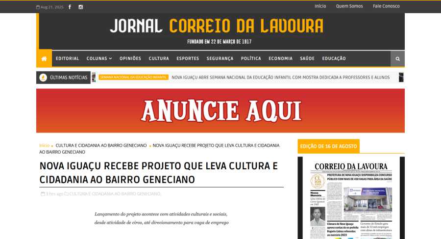 oi publicado no site Correio da Lavoura em 21 de agosto de 2025 – Nova Iguaçu recebe projeto que leva cultura e cidadania ao bairro Geneciano.