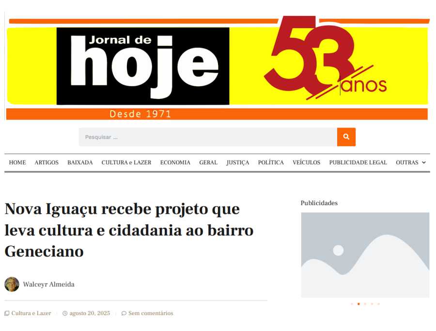 Foi publicado no site do Jornal de Hoje em 21 de de agosto de 2025 – Nova Iguaçu recebe projeto que leva cultura e cidadania ao bairro Geneciano.