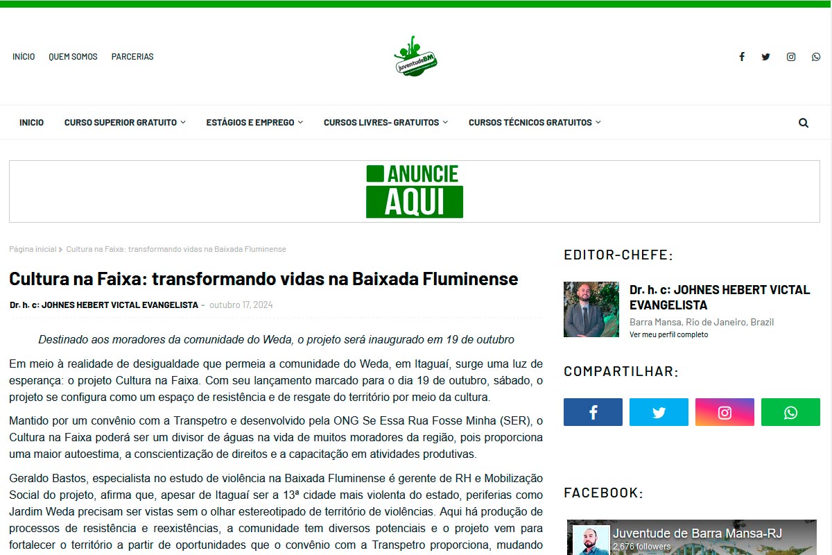 Foi anunciado no Site Juventude BM o lançamento do projeto Cultura na Faixa no Jardim Weda em 17 de outubro de 2024.